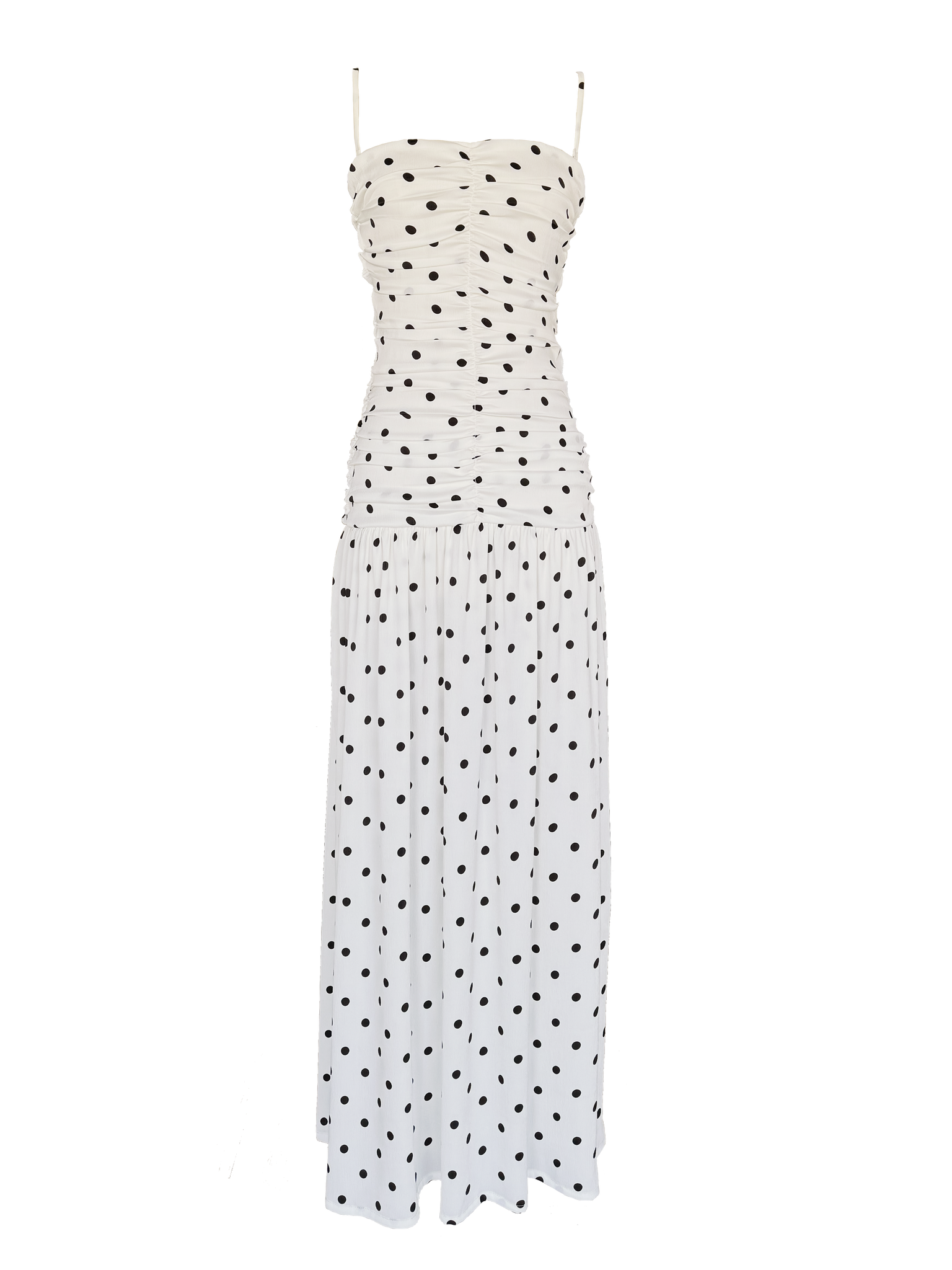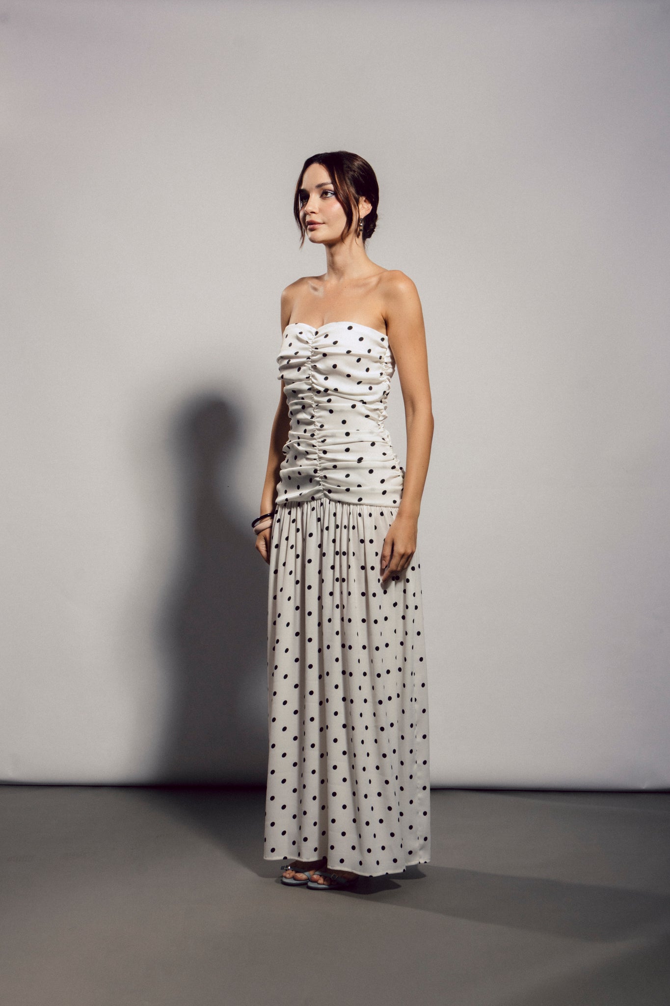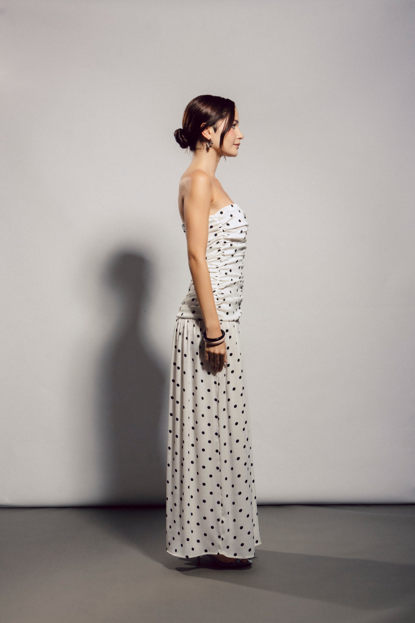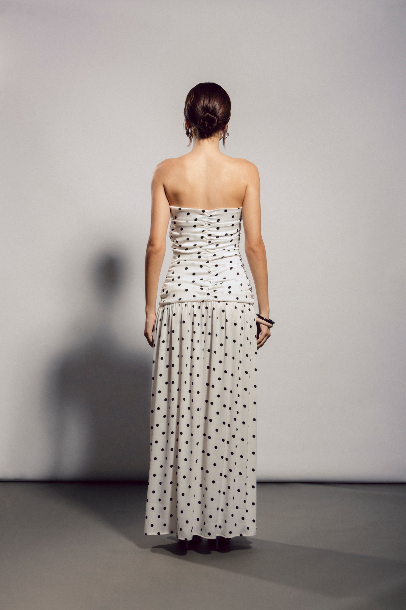 Maxi vestido de seda corrugada con print de lunares blanco y negro, escote strapless, el corpiño lleva recogido vertical con cierre invisible en costado y forro en interior y falda amplia. Incluye tirantes removibles. Composición: 100% Polyester