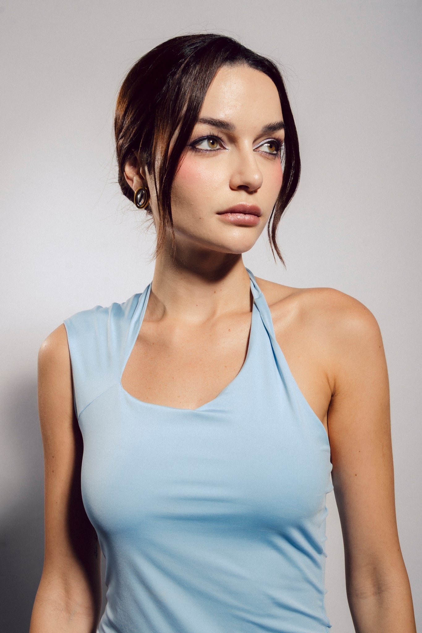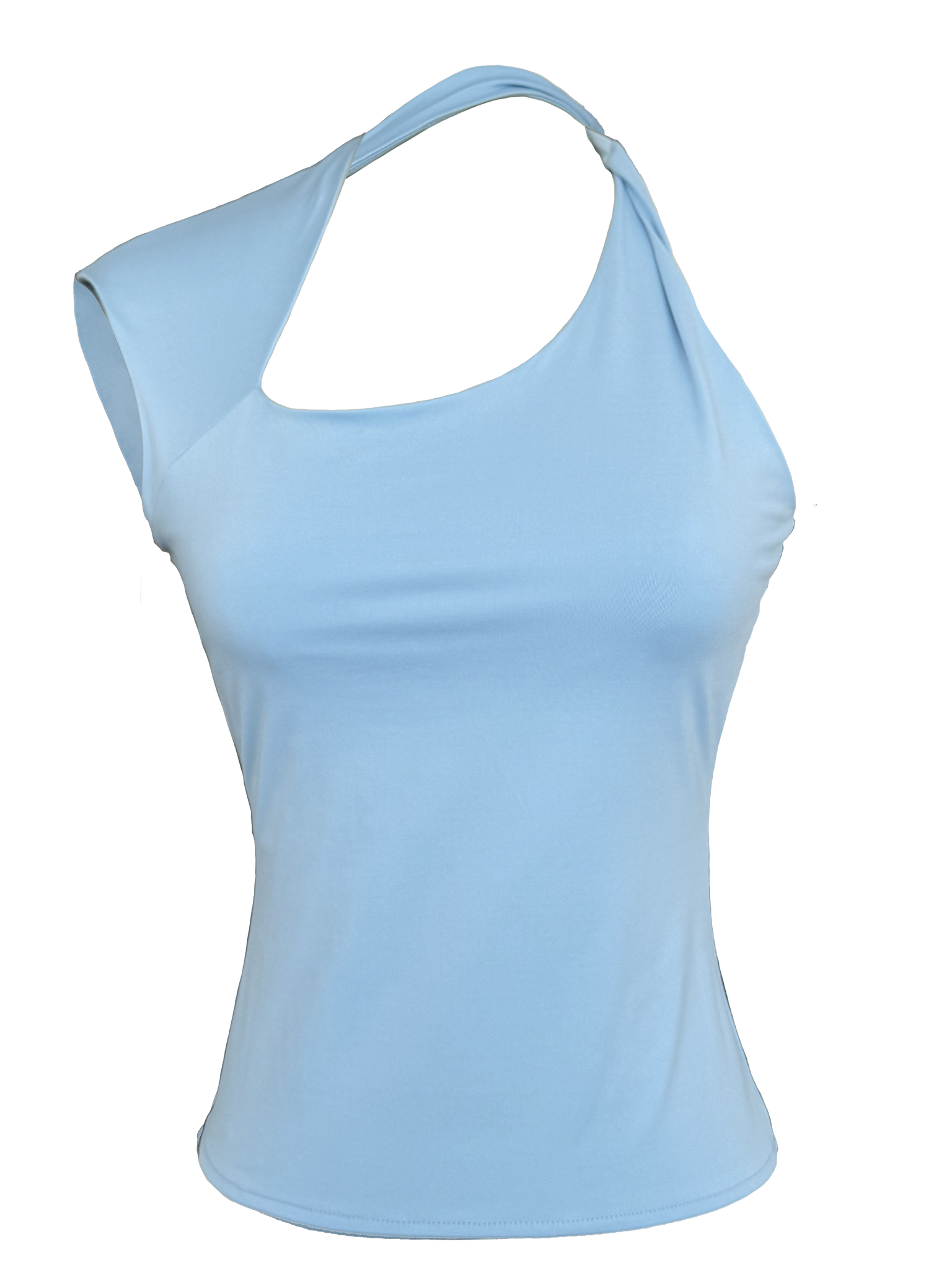 Top asimétrico, lleva una manga corta y halter, escote en espalda y tela doble en la parte del busto. Composición: 87% Polyester, 13% Spandex