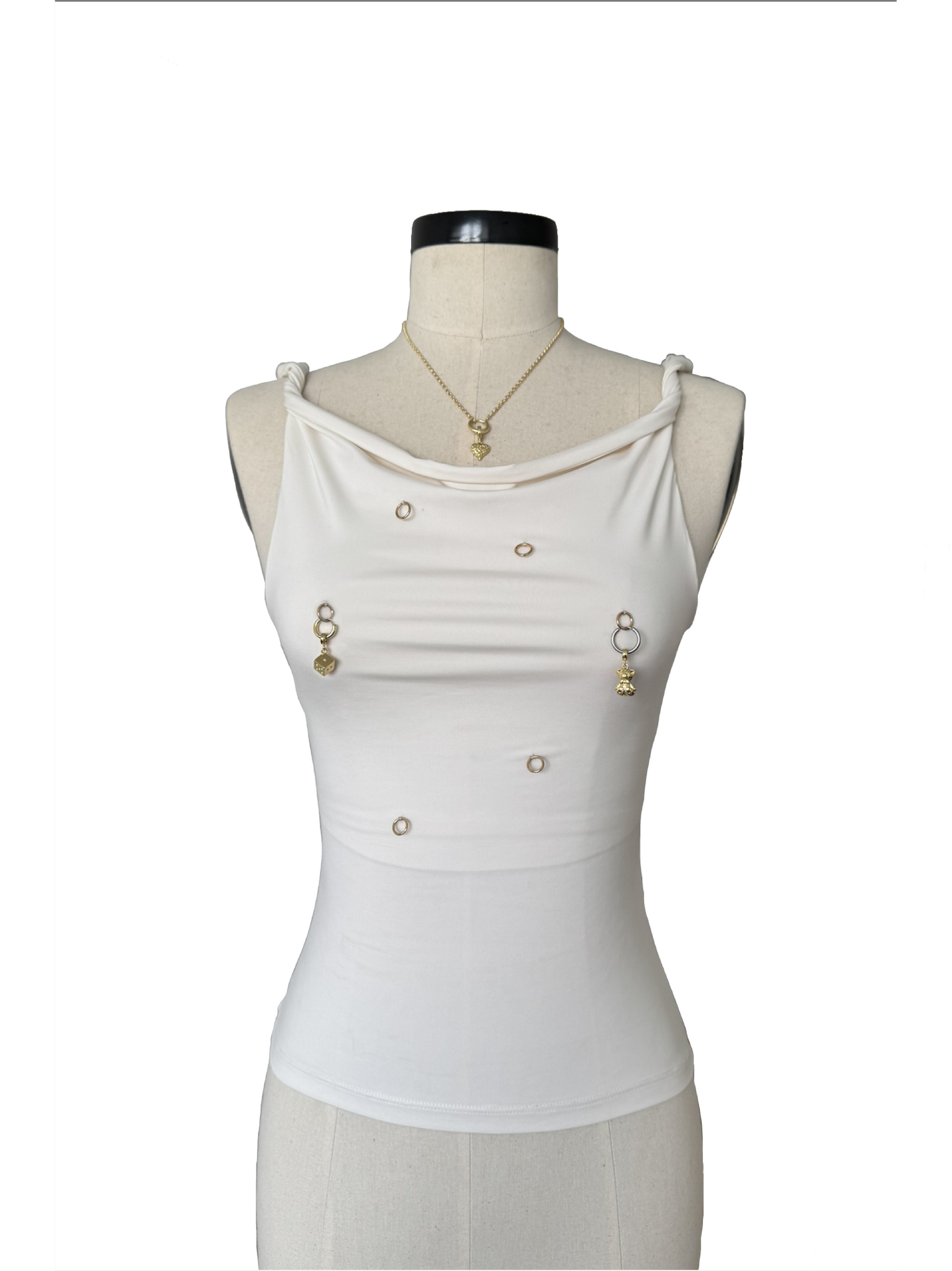 Top con 3 formas de uso para que sea totalmente versátil. Los charms se pueden colocar en el top, usar como aretes, ponerlo en el collar o donde tu quieras, ofreciendo múltiples formas de uso según tu estilo y creatividad.