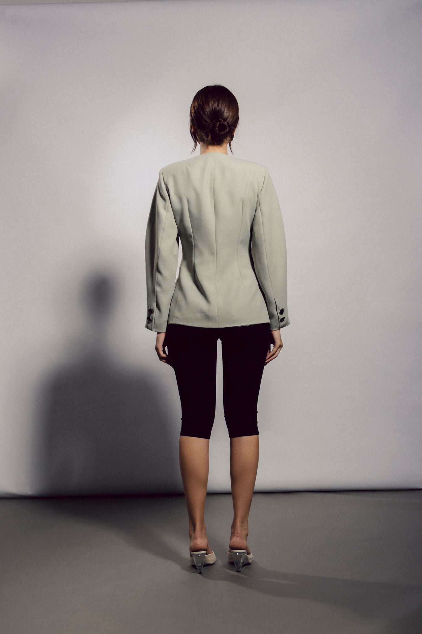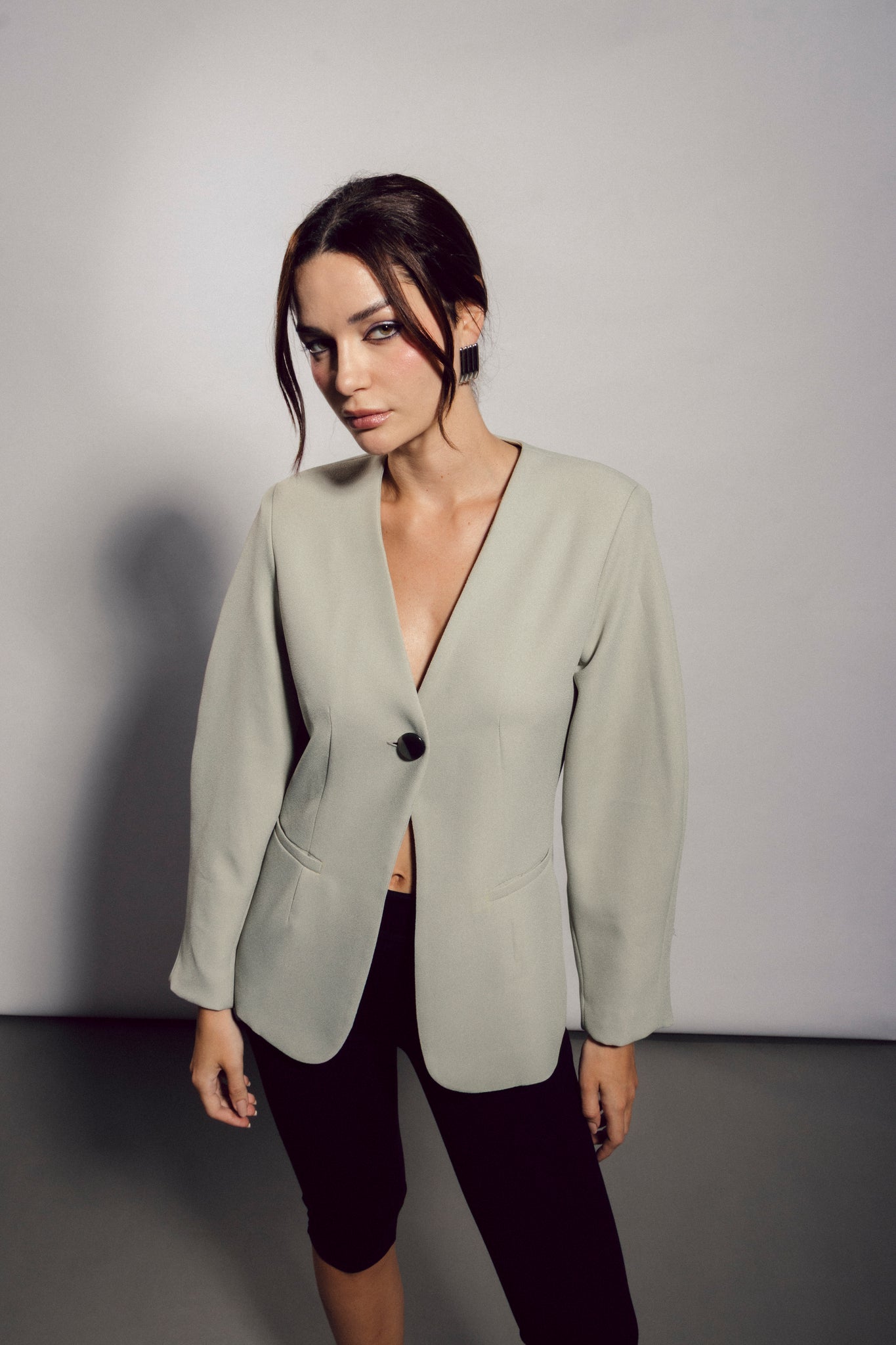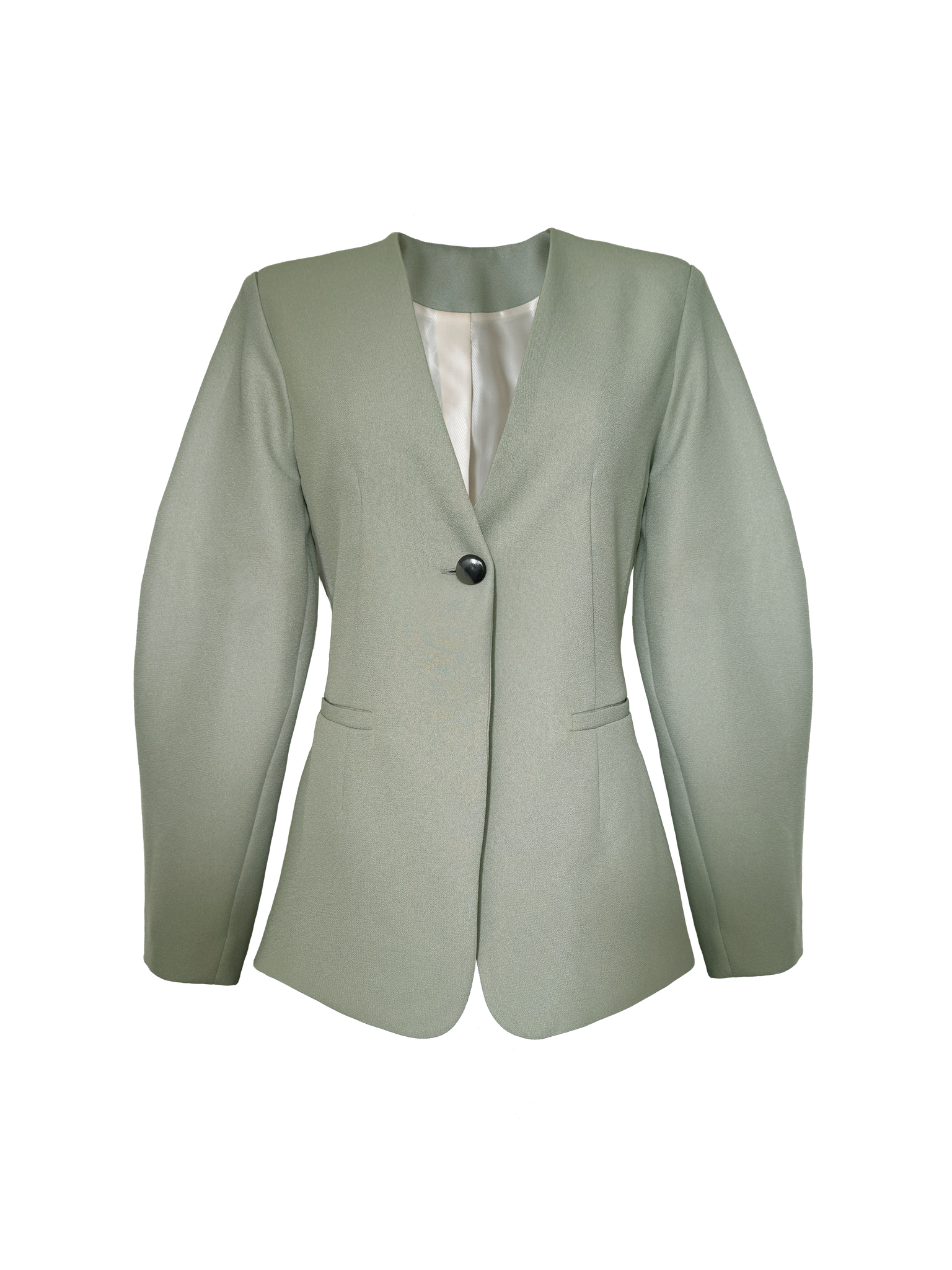 Blazer verde pálido estructurado, sin solapas, entallado con mangas globo, bolsillos ojala no funcionales en delantero. Forro en interior, botones en mangas y en delantero. Composición: 100% Polyester